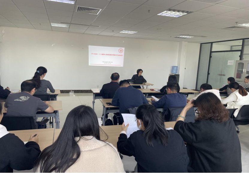 张嵩以“学习党的二十大精神,深刻把握高等教育发展趋势”为主题,将党的二十大精神与我院发展实际和专业特色相结合,从高等教育在中国式现代化历史进程中的地位、我国高等教育发展的基本判断、高等教育发展的战略要求和逻辑转变、新时代高等教育改革创新发展的基本任务四个方面进行了讲解。