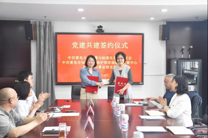 质量与标准化学院委员会与中共青岛市知识产权保护和市场服务发展中心知识产权事业部支部举行党建共建签约仪式。我院党委书记张嵩、党委副书记张磊一行5位同志,青岛市知识产权公共服务平台主任刘建志、党支部书记张宁等5位同志参加了签约仪式。
