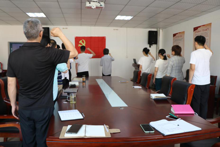 面对鲜红的党旗,党支部书记张嵩作为领誓人,带领支部全体党员一起高举右手,再次庄严宣誓。“我志愿加入中国共产党……随时准备为党和人民牺牲一切,永不叛党。”铿锵恢宏的誓词,强烈震撼着在场的每一位党员,一字一句,神圣而豪迈,体现了党员同志们对中国共产党的无限忠诚。