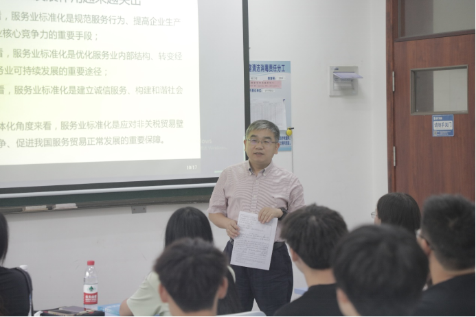 2021年9月6日,在新学期的首个教学日,我校党委书记胡金焱,副校长孔伟金,副校长肖江南深入我院教学一线开展听课活动,深入课堂了解教师上课、学生纪律等,全面检查教学情况。胡金焱书记在听了我院孙慧波老师的《服务标准化》课程后,与任课教师和同学进行了亲切交流。
