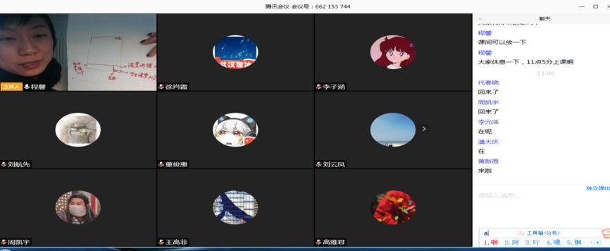 根据上课情况,上课教师程馨、海晶晶、袁宇、庄馨雨老师均选用了腾讯会议软件作为上课工具。在课堂上,大家已经比较熟练的使用该软件,并且增加了面对面视频、板书、在线播放视频、提问等环节,使得线上课堂更加灵活多变,更加生动。
