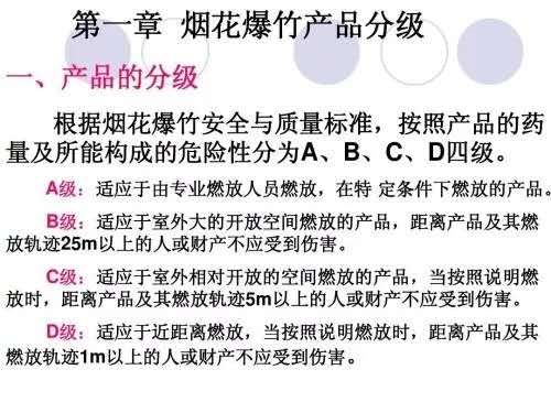 新闻发布会上,有关专家介绍,随着生产机械化和自动化程度的不断提高,加之国家标准对安全性的要求越来越严,我国烟花爆竹产品质量安全水平不断提高。专家同时建议消费者,节日期间应到持有烟花爆竹经营(批发)许可证的专营店购买烟花爆竹,选购时应选择药量较少的C级和D级“个人燃放类”产品,并且在室外宽敞无遮蔽的安全场所燃放,确保燃放安全。以下是产品的四个分级: