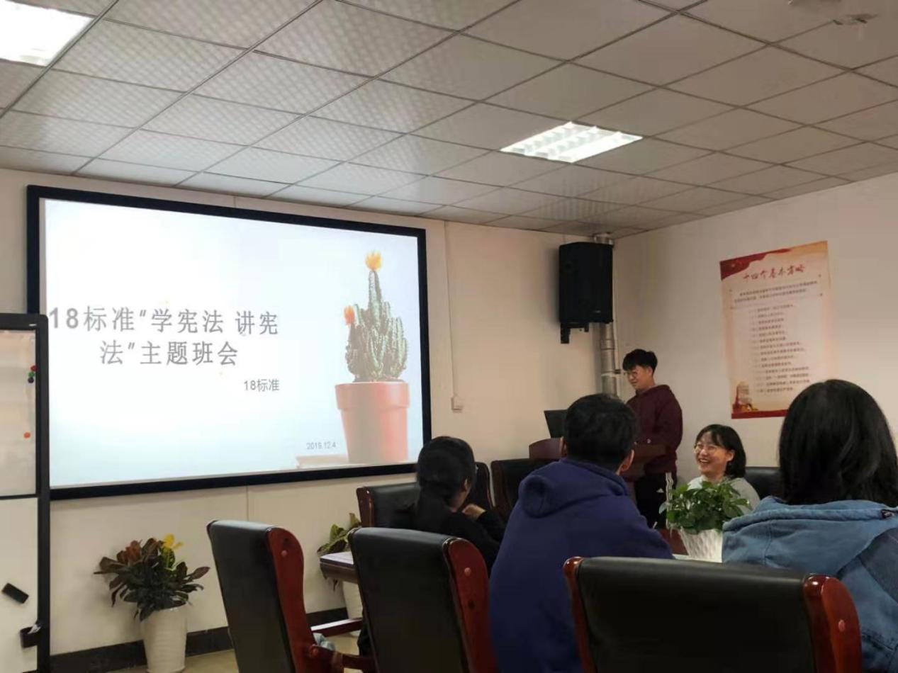 18标准在413会议室召开了关于“宪法宣传周”宣传宪法知识的主题班会。本次主题班会由18标准班委组织。由李元浩同学进行会议主持。参加班会的是18标准全体同学。