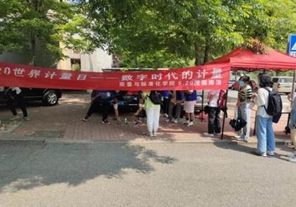 滢园路口组织开展“第23个世界计量日”现场宣传活动,通过悬挂横幅、张贴海报、趣味套圈等形式,向过往的同学们宣传活动,让同学们深刻感受到计量日中的标准化之道。