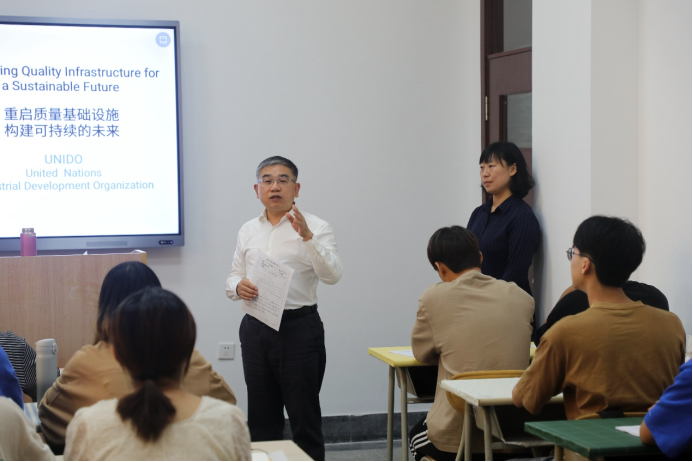 图1 胡金焱书记在《国家质量基础设施》课堂调研交流