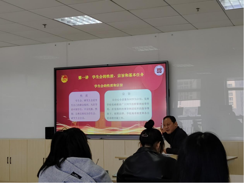 张磊围绕“怎样成为一名优秀的学生干部”,首先解读了学生会(研究生会)的性质、宗旨和基本任务,然后分“应具备的素质”、“注重提升几种能力”、“发挥好几种作用”、“处理好几种关系”、“掌握科学工作方法”、“本年度重点工作”等六个专题,结合实际案例进行了详细讲解。