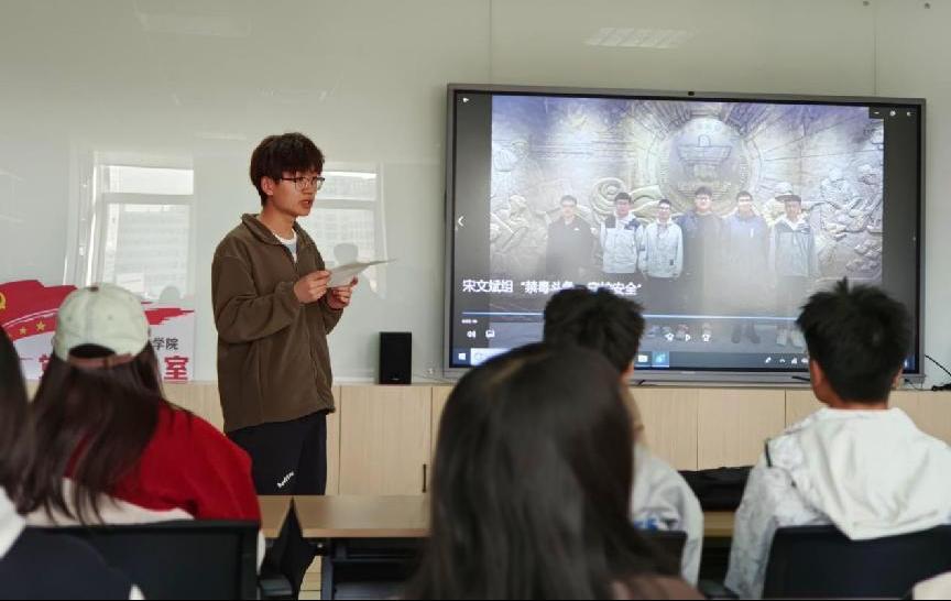 首先,学院学生会主席李鲁兴介绍了本次安全教育活动前期开展情况。学生会组织8支队伍,分别前往中国海军博物馆、青岛一战遗址博物馆、青岛市禁毒预防教育展馆和青岛华仁输液文化博物馆等,收集安全教育素材,制作成国家安全、远离毒品、食品药品安全、公共卫生、消防和用电安等不同主题的全安全教育小视频。接下来,各小组负责人把制作的安全教育视频播放给与会的同学们观看。