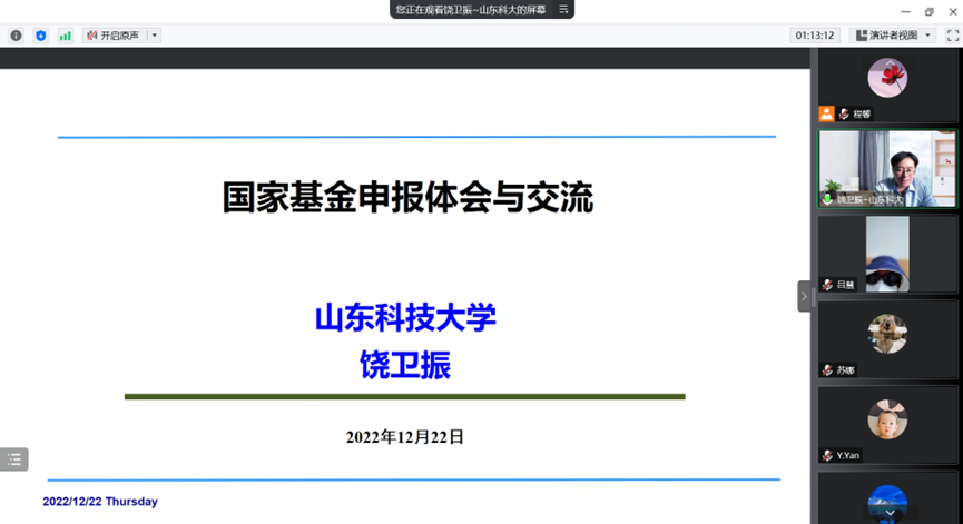 2022年12月22日,我院邀请山东科技大学经济管理学院副院长饶卫振教授为我们带来《国家基金项目经验交流报告》的学术讲座。本次讲座由程馨副院长主持,学院教师和研究生在线参会。