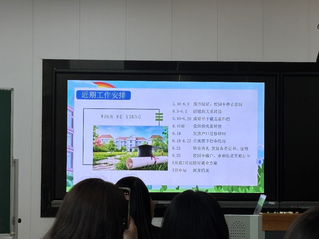 班会还设置了实用的教育环节,金老师详细讲解了离校手续办理流程、安全教育知识、文明离校要求以及签约注意事项,确保同学们能够安全、顺利地完成毕业过渡,以最佳状态开启人生新征程。