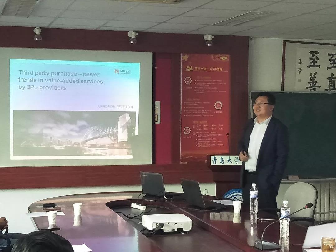 史杨焱博士作了题为《Third party purchase----newer trends in value-added services by 3PL providers》的学术报告,讲解了第三方物流的含义,指出了目前第三方物流面临最重要的问题是成本问题和信任问题,并通过举例新西兰外包率等内容分析了第三方物流的当前形势。