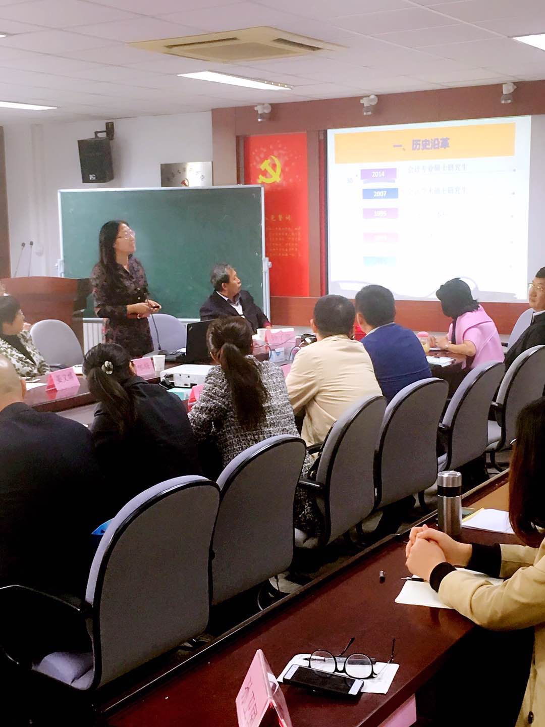 接下来,范英杰主任向大家主们介绍了MPAcc专业情况,包括近几年青大MPAcc专业招生分数、招生人数、报录比例以及本专业学生就业情况等。让在场的各位导师对MPAcc专业学生情况及水平有了全面了解,为接下来校外导师见面会建立了基础。