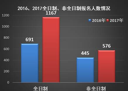 2017年研究生入学考试报名人数达到1743人,创历史新高!相对2016年的1136人,报名总数提高了53.4%。其中,全日制研究生1167人,相对去年提高了68.9%;非全日制研究生576人,相对去年提高了29.4%。