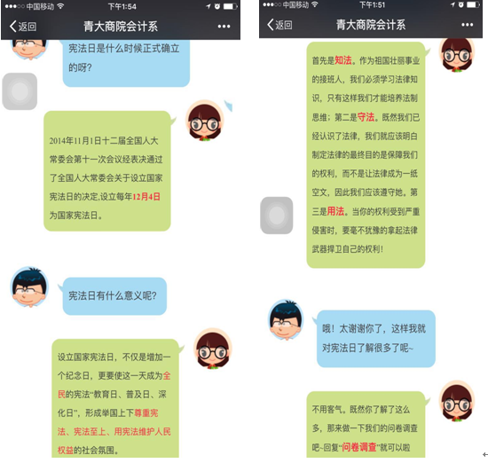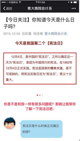 会计学系团总支开展了问卷调查、宪法知识小百科、争做遵纪守法先锋党员座谈会等活动,在我系学生中产生良好的反响。