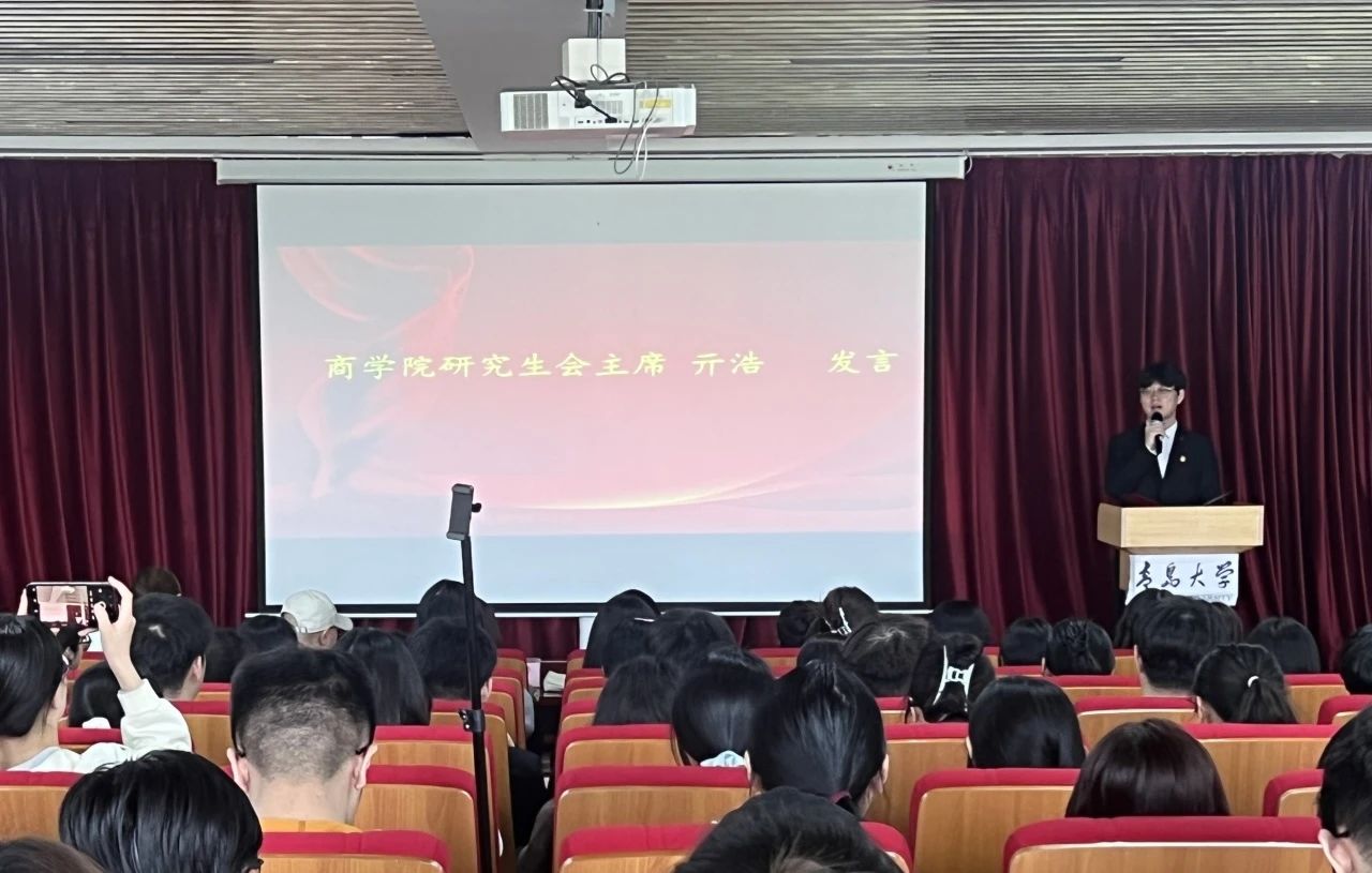 研究生会主席亓浩号召大家作为新时代青年,要以书为帆,以学为桨,乘风破浪,鼓励让大家在知识中汲取力量,斗志昂扬,以饱满的热情和坚定的决心,投身到学习和实践中去,不断提升自己的综合素质和能力水平,为国家的繁荣富强贡献青春力量。