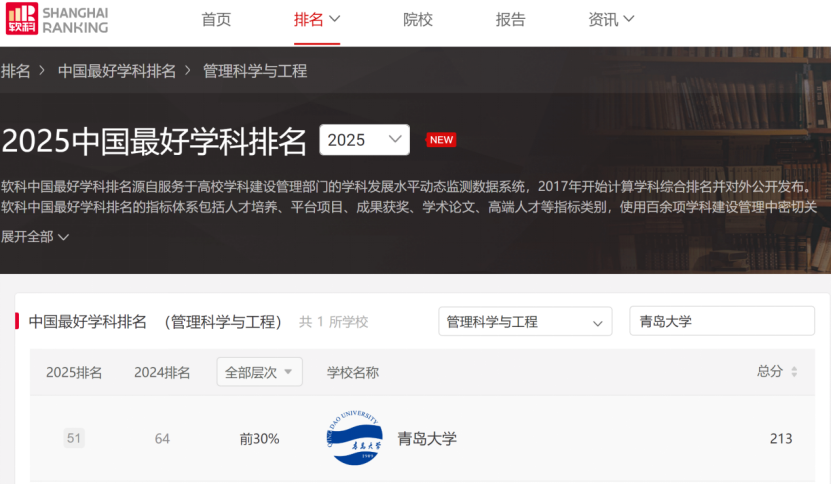 2025年10月15日,高等教育评价专业机构软科正式发布“2025软科中国最好学科排名”。榜单显示,我院管理科学与工程学科位列全国第51名,较去年强势提升13个位次,连续两年跻身全国前30%行列,实现历史性突破。这标志着该学科在师资力量、人才培养、科研创新以及社会服务等多个维度实现全面跃升,学科实力与核心竞争力获得权威认可。