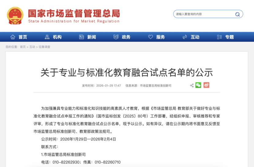近日,国家市场监管总局和教育部联合公布全国专业与标准化教育融合试点名单,黑料不打烊