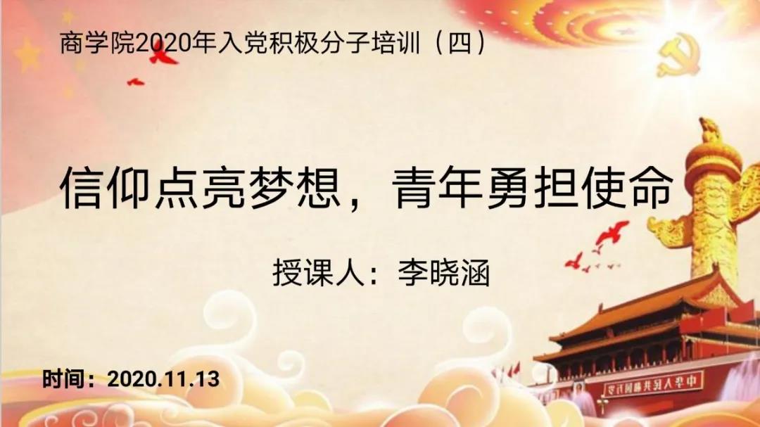 这次李晓涵老师主要讲授了信仰的重要性,强调我们青年应该勇于承担上一辈领导人留下的使命。老师通过多个实例激起了我们的爱国情怀,在观看了令人潸然泪下的视频之外,我明白想要成为一名合格的共产党员,我们做的远远不够。无数的共产党员在用自己的时间甚至生命捍卫祖国的尊严,这就更加激励我们应该踏踏实实做好每一件事情,为以后祖国的未来打好基础。我们不是生在一个和平的年代,而是生在了一个和平的国家,我感恩我的祖国母亲,感恩中国共产党。“多数人因看见而相信,少数人因相信而看见”我愿意做那一少部分中的一员。