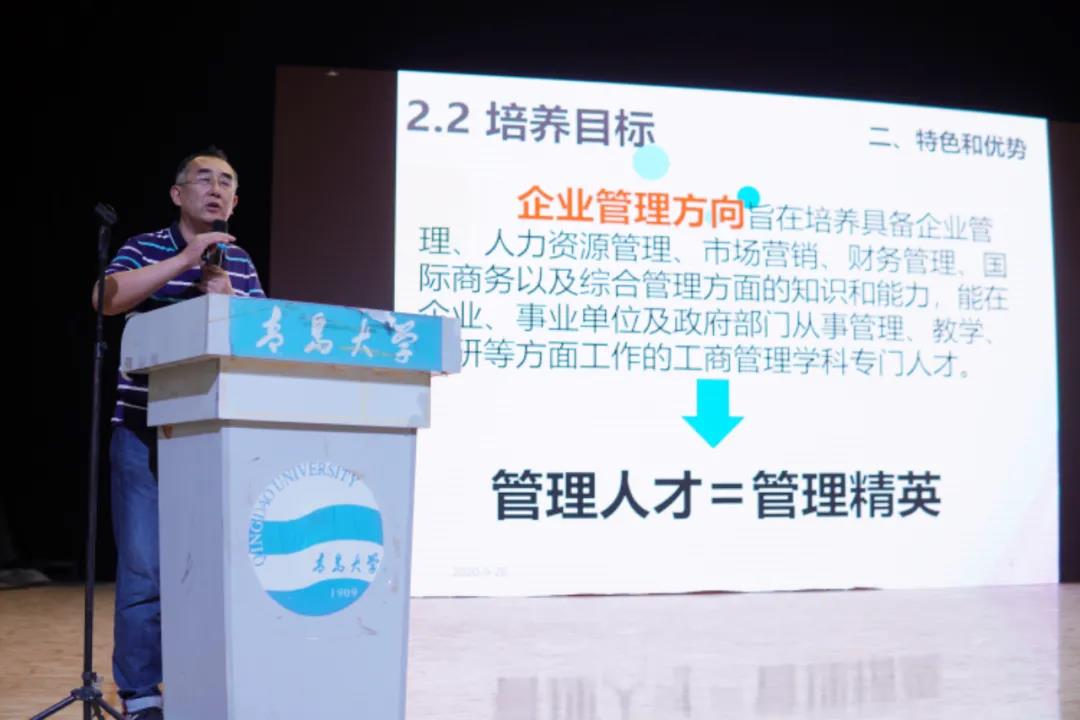 工商管理系主任马伟老师介绍了专业设置以及该专业的特色和优势,向新生明确了企业管理方向的培养目标及课程体系,展示了本专业的高水平教师队伍以及三位一体培养体系,同时并说明了本科导师制和科研、就业创业以及考研深造的介绍。