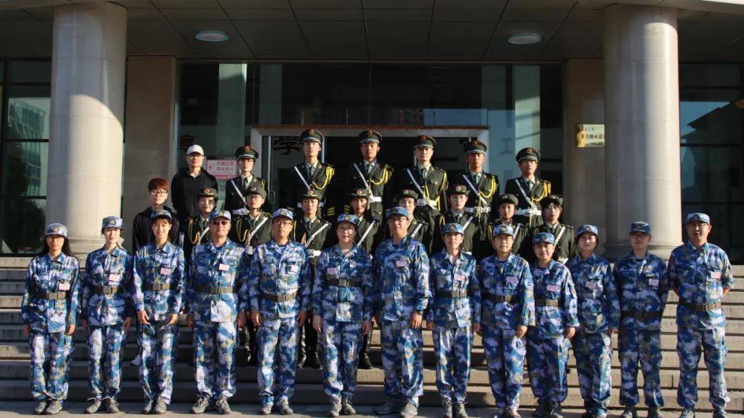 (军训工作第四临时党支部所有成员与国旗班队员合影)