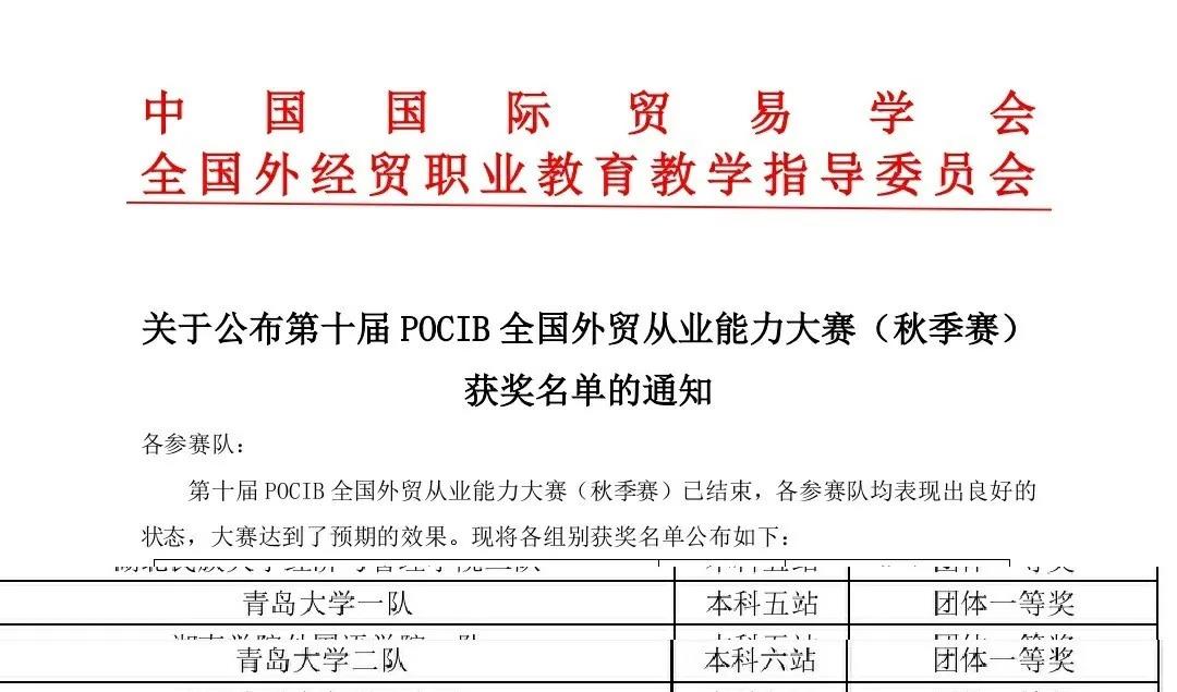 国际商务系二十位同学组成的两个团队在第十届POCIB全国外贸从业能力大赛中荣获两项团体国家一等奖,1项个人国家一等奖、5项个人国家二等奖、9项个人国家三等奖。