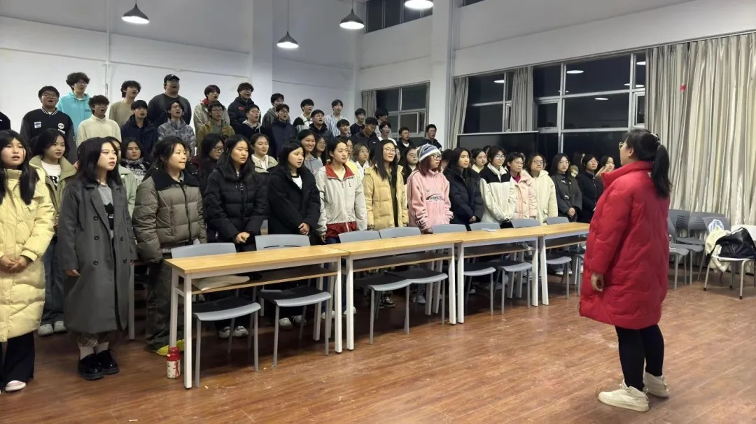 在日常训练中,同学们认真参与,相互鼓励。担任指挥的王佳美老师不仅教授同学们如何发声、如何控制音量,更是通过深厚的功底,帮助同学们深入把握歌曲的情感内涵。每当排练遇到难题时,王老师总能耐心纠正,并激励同学们相信自己。