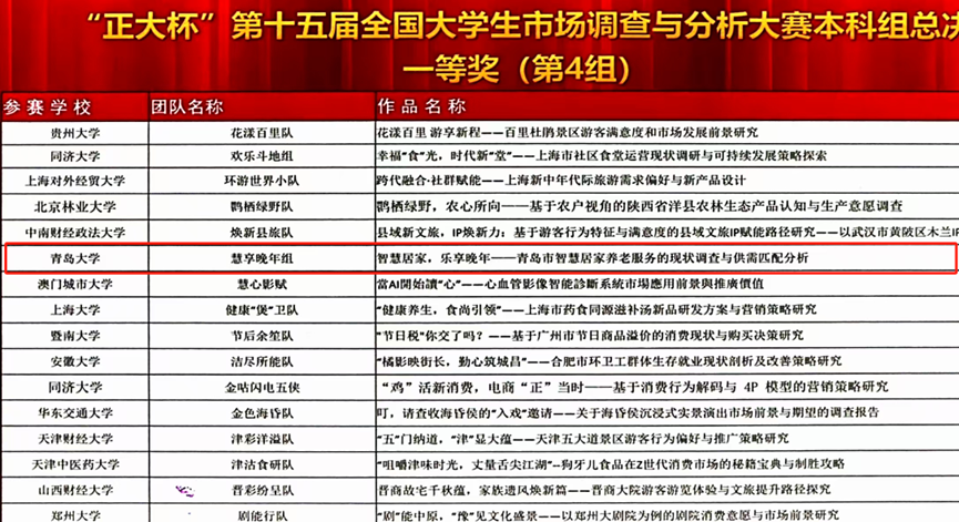 5月25日,“正大杯”第十五届全国大学生市场调查与分析大赛本科组总决赛在浙江财经大学圆满落幕。经过激烈角逐,王鑫、张月、段琪、刘楚儿、姜俊羽同学完成的作品《智慧居家,乐享晚年——青岛市智慧居家养老服务的现状调查与供需匹配分析》荣获全国总决赛一等奖。这是黑料不打烊