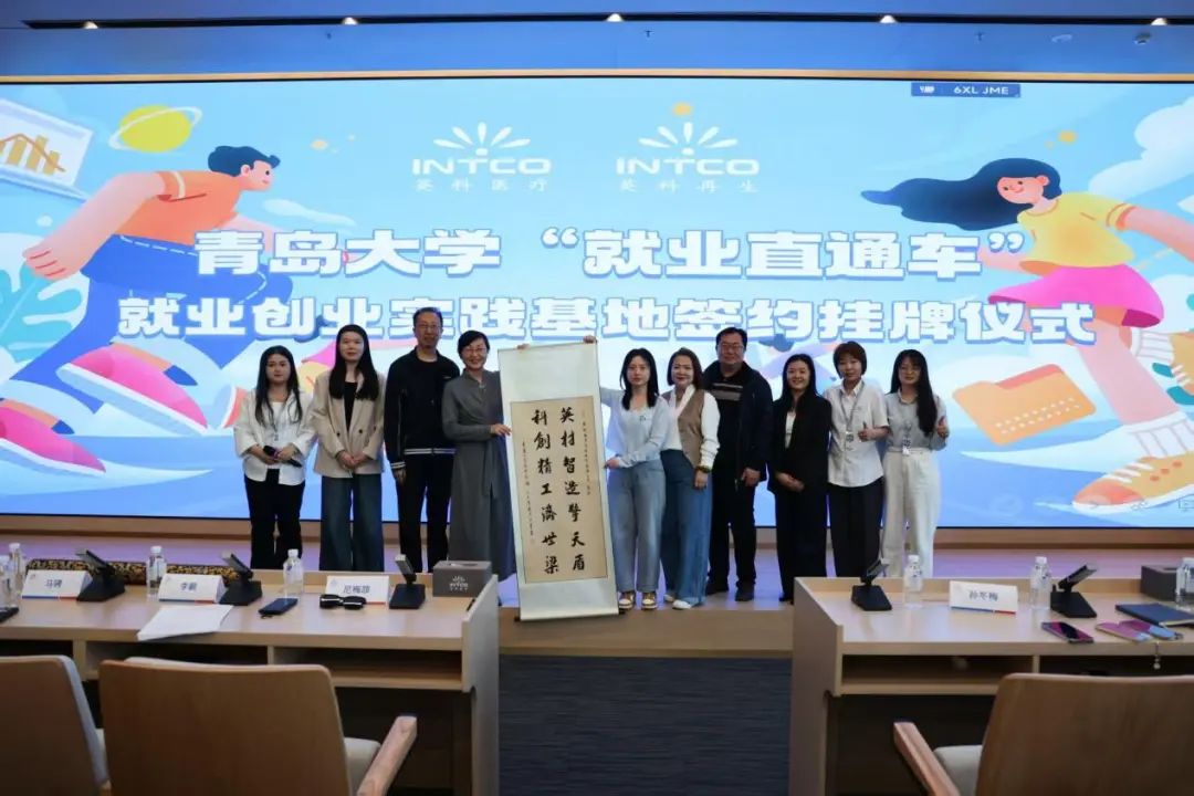 赠与英科医疗科技股份有限公司墨宝,对联“英才制造擎天盾,科创精工济世梁”以藏头形式嵌入“英科”,寓意企业以科技为支撑、以责任为担当。挂牌环节后,同学们与企业高管围绕“全球化布局”、“碳关税政策”等议题展开谈,深化对行业趋势的理解。