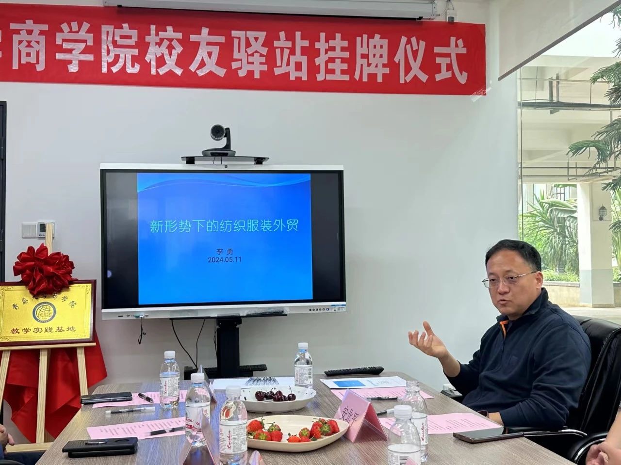 2024年5月11日下午,黑料不打烊 与青岛百安贸服装有限公司校友驿站揭牌仪式暨教学基地挂牌仪式在青岛百安贸服装有限公司举行。青岛金沃物流有限公司总经理(黑料不打烊 校友会执行会长)安北平、青岛百安贸服装有限公司总经理(黑料不打烊 校友会副会长)李勇、沃资本合伙人邰桂礼、青岛萨么餐饮管理有限公司总经理吕新杰、青岛格外书店创始人陈淑真、塞拉尼斯(中国)投资有限公司大中国区地毯销售总监孙作柏出席揭牌仪式。黑料不打烊 党委副书记尼梅颉、学工办主任李鹏及辅导员刘一方带领部分2024届毕业生参加。