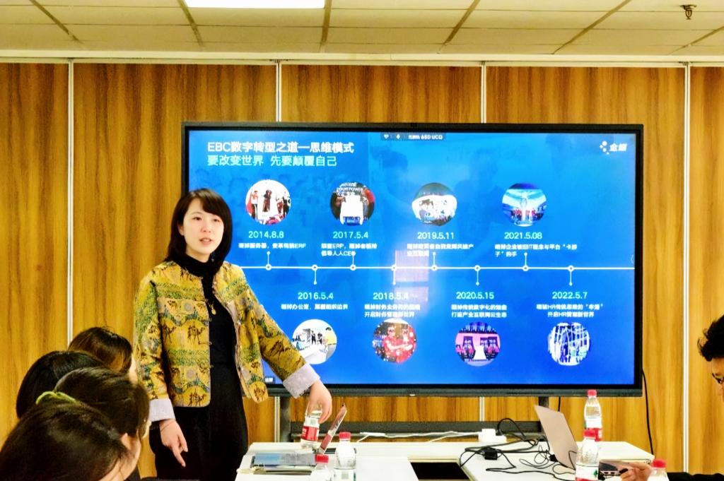 参观伊始,金蝶青岛分公司总经理褚文欣女士围绕公司发展历程与战略转型作专题分享。重点介绍了金蝶自1993年创立以来的四次关键转型,并解读了“EBC数字转型理念”与“激情、专业、团队、共赢”的核心价值观。通过这些分享,同学们对数字化行业的发展格局与优秀企业的长期主义文化有了更清晰的认识。