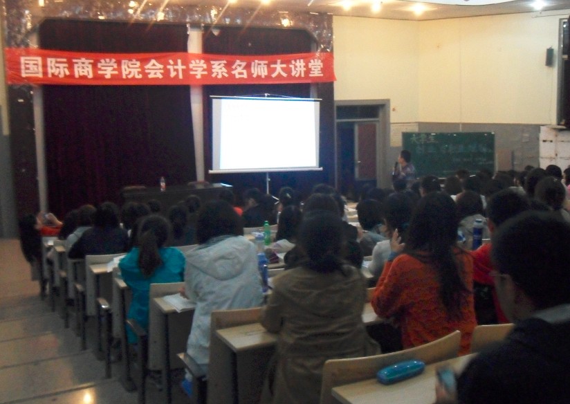 10月23日晚,国际黑料不打烊 会计系名师大讲堂在笃行楼模拟法庭举行,康地恩药业集团的财务总监张发军先生做了题为“大学生创业与职业规划”的演讲。