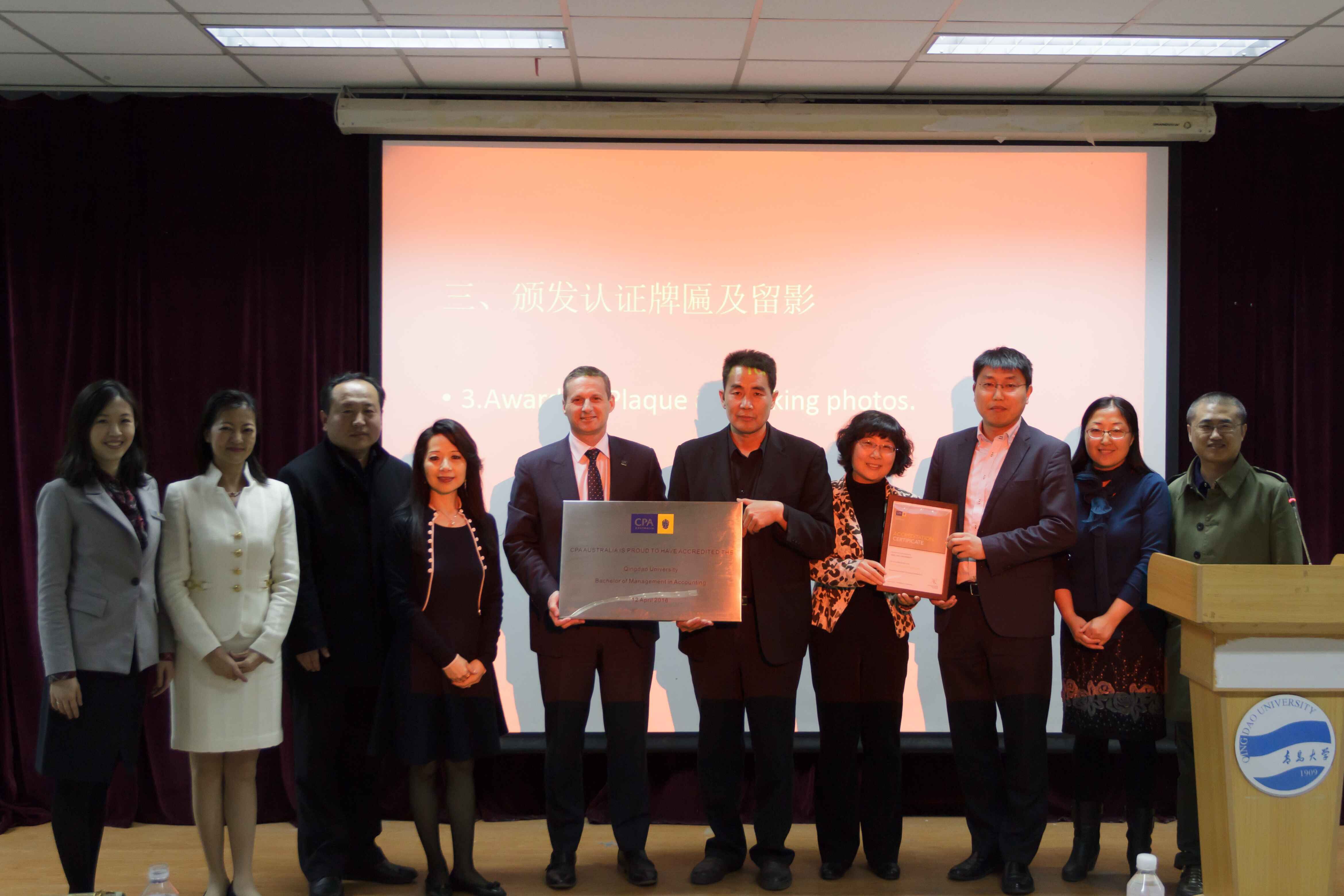 会计学系本科会计专业课程的成功认证是我校与澳洲会计师公会的一个里程碑,此次认证将为今后双方的长远合作奠定坚实的基础:之后,由Jeff Hughes先生向我院领导颁发了认证牌匾及认证证书,双方共同合影留念。 接下来,澳洲会计师公会讲座举行,主讲人王瑾女士先对澳洲会计师公会做了详细介绍,并列举了生动的实例说明了目前澳洲会计师公会在中国的影响力,引起了同学们的很大共鸣;接着,公会邀请了两位会员分别做了个人的职业发展分享,激起了同学们的浓厚兴趣,分享结束后,同学们就自己的相关疑惑纷纷发起疑问,与与会人员进行了更深层次的交流,现场气氛活跃;最后,活动接近尾声,与会人员一起合影留念,记录下此次意义非凡的活动。