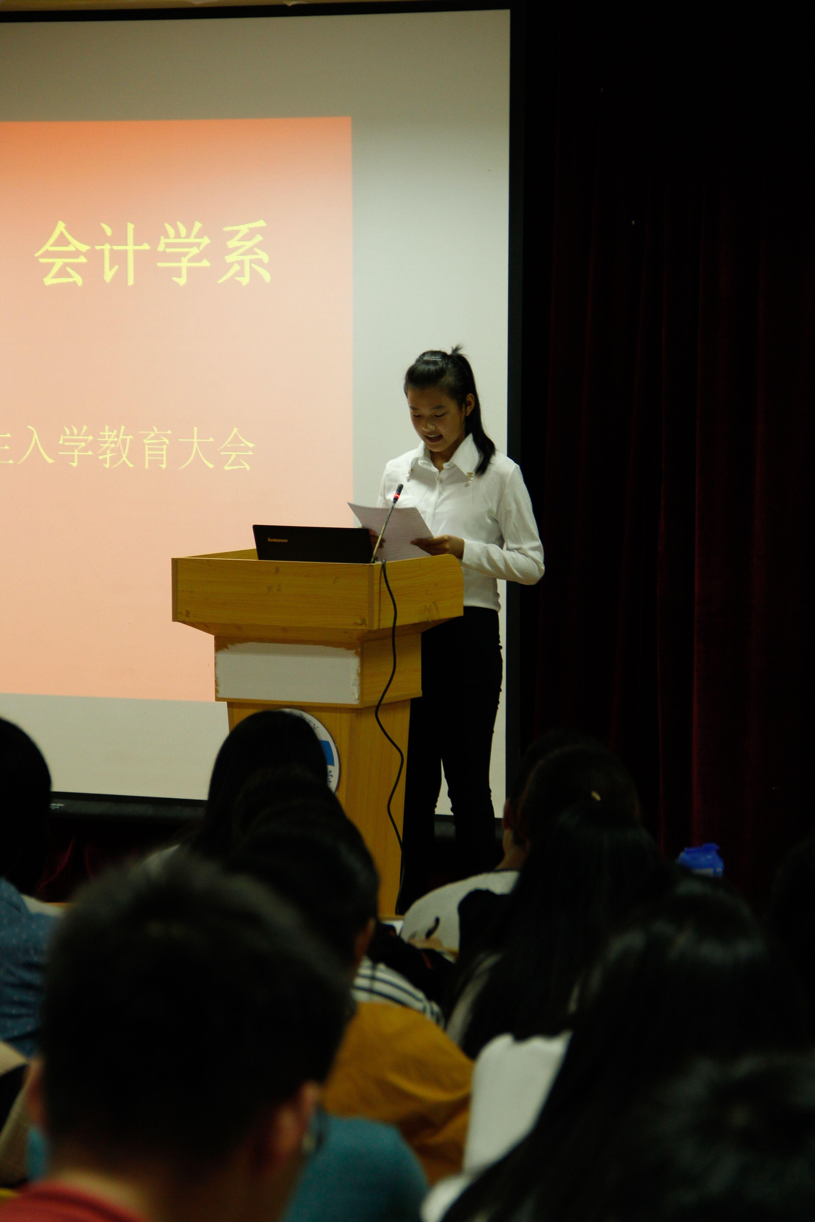 最后,会计学系2013级学生代表闫雯学姐结合自己的切身体验从学习、生活、考证三个方面与新生进行了交流,希望学弟学妹们能够规划好自己的大学生活,不留遗憾。