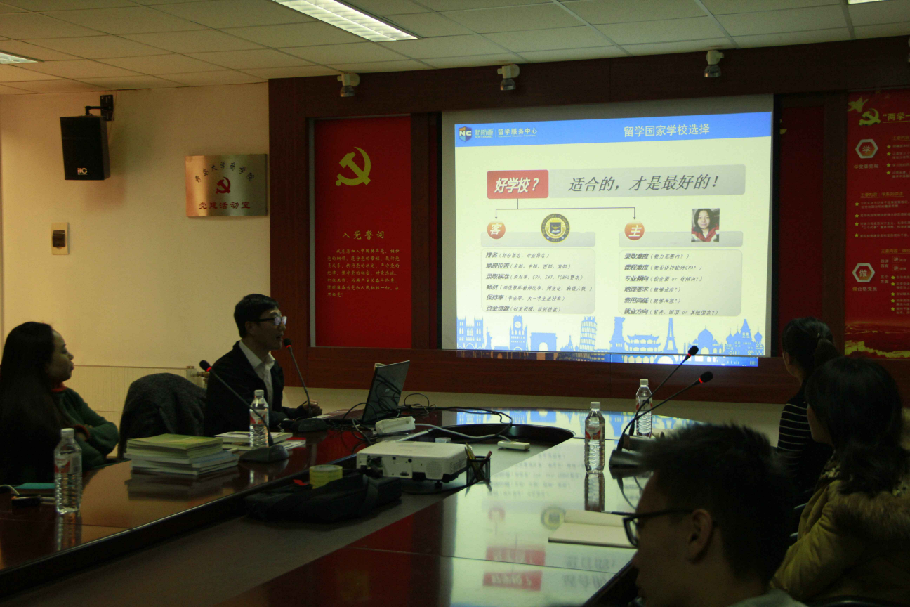 首先金佳怡学姐介绍了她的大学生活。学姐对自己的大学生活有着合理的规划。学习,社会实践活动,社团活动,创业,虽然事情繁琐,但由于学姐安排得当,她的大学四年十分多彩。金佳怡学姐强调身处大学中的我们对自己的未来要有合理的规划,要早早找到自己的方向。出国留学就是很多人关注的方向之一。