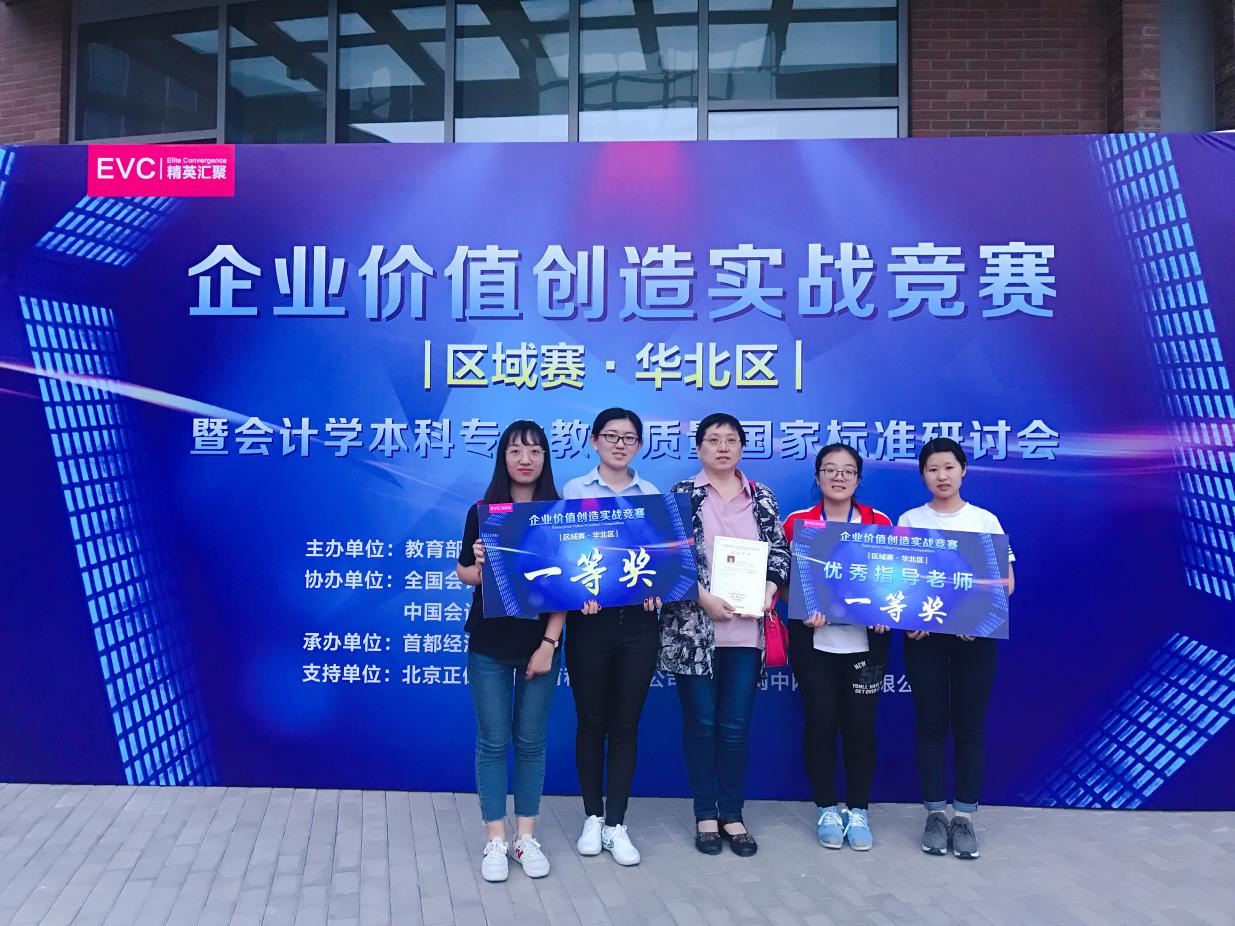 2015级会计学系王静、武君君、孟令杰、黄岑四位同学在张波和谢彦老师的指导下参加了此次比赛,并获得华北区团队一等奖和优秀指导老师一等奖的荣誉。