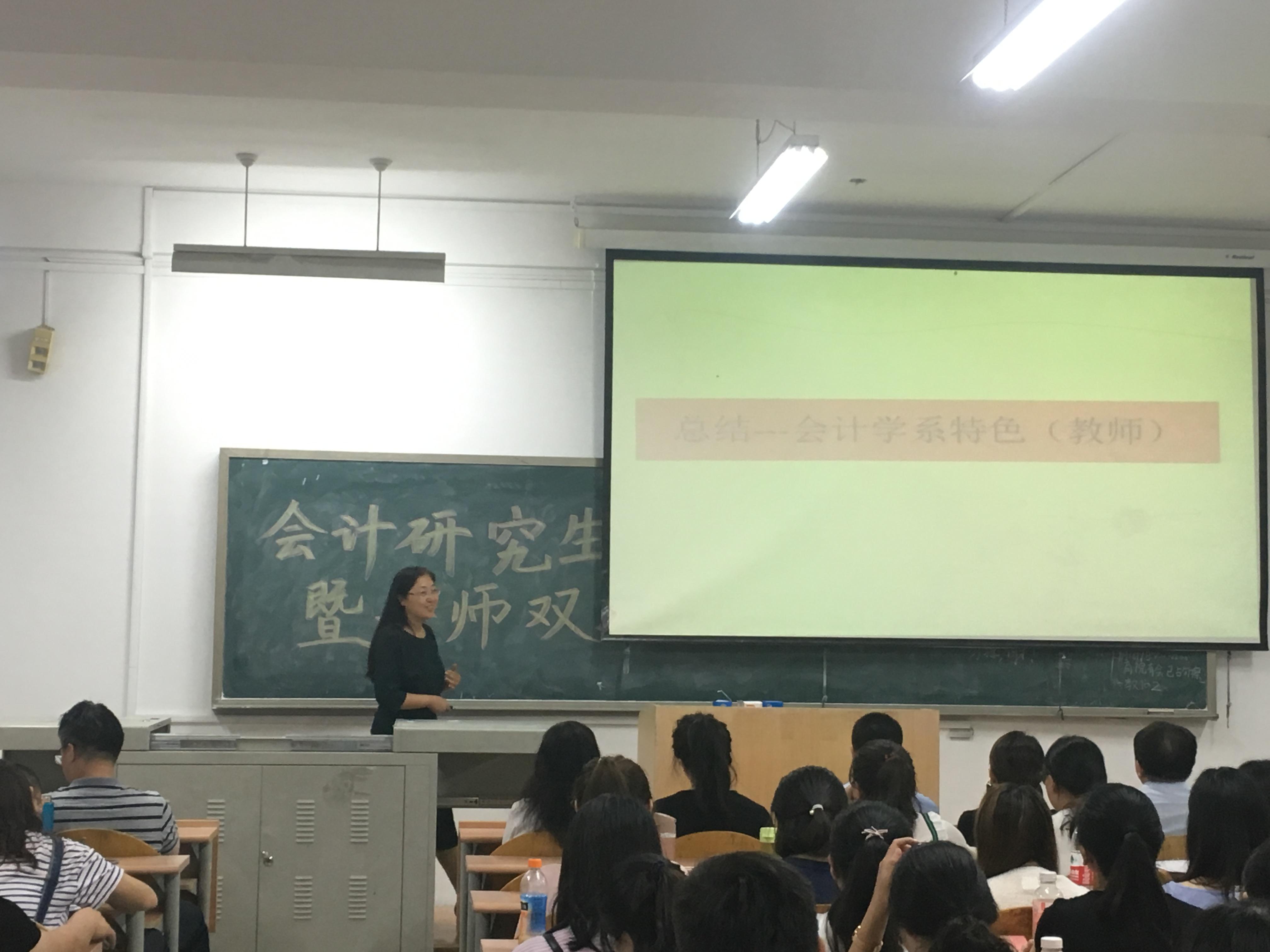 副院长周咏梅老师、会计学系主任范英杰老师和会计学系辅导员张瑶老师分别发表了讲话,主要对会计学系做了简单介绍,并且对各位研究生导师进行了详细介绍,以及对研究生生活提出了一些建议。
