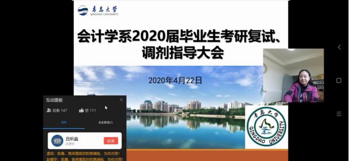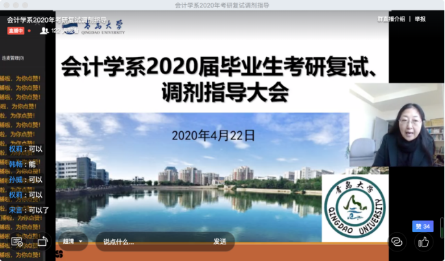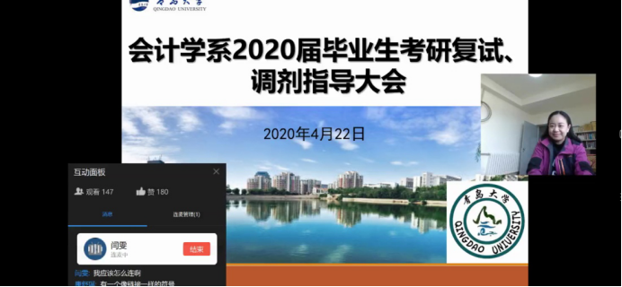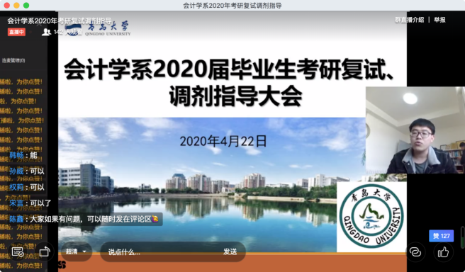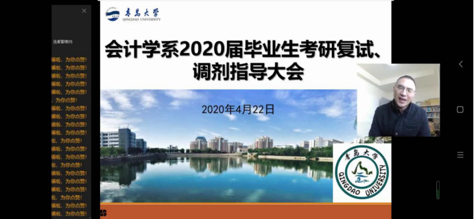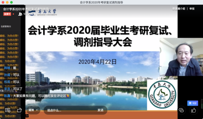 会计学系举行2020届毕业生考研复试、调剂指导大会,会议采取钉钉直播的方式,由系团总支书记陈鑫老师主持,系主任范英杰老师,副主任鲍在山老师、康进军老师和高宇老师分别做主题发言,共计140余名考研过国家线的毕业班同学参与了此次指导大会。