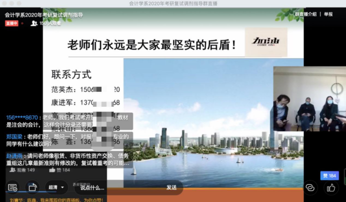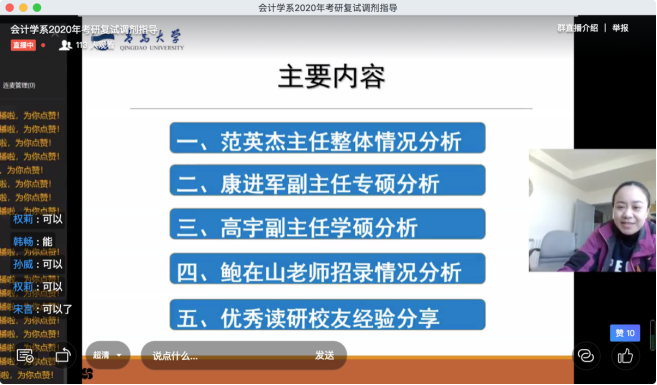 主题内容结束后,五位老师共同坐在镜头前,为同学们答疑解惑。同学们积极互动,纷纷提问,涉及到复试时间、复试形式、考察内容、招生计划、政审等一系列复试相关问题,老师们对大家的问题一一作了解答,并衷心祝愿大家能够拿到研究生录取资格。