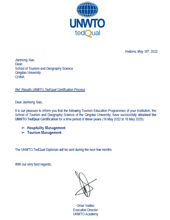 2022年5月16日,联合国世界旅游组织教育质量认证委员会(UNWTO.TedQual)函告通知,我院旅游管理、酒店管理两个本科专业通过该机构的旅游教育质量国际认证,认证有效期3年,这是目前黑料不打烊