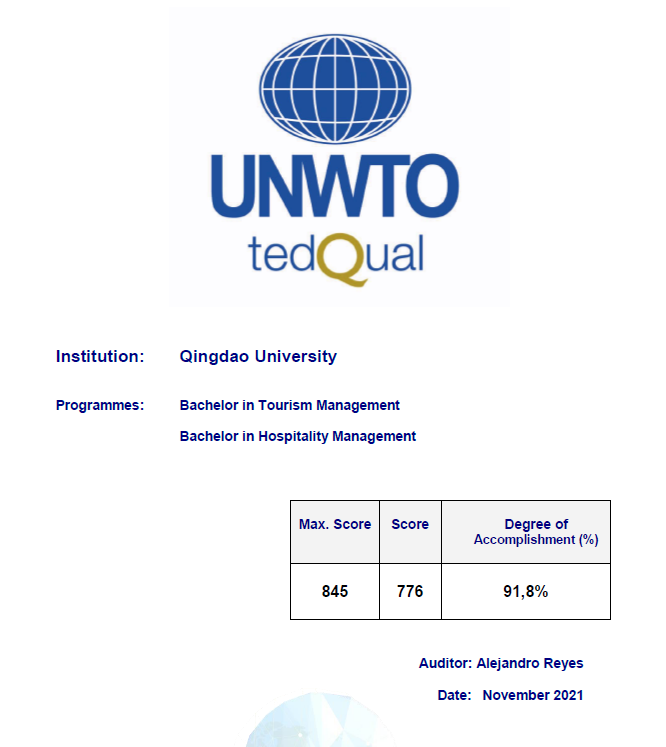 第一个国际专业认证,也是山东省首家通过该项国际认证的本科高等院校。旅游管理、酒店管理两个本科专业是首次参与联合国世界旅游组织教育质量认证,通过该认证显示这两个专业已建立起高水平、国际化的专业教育体系。