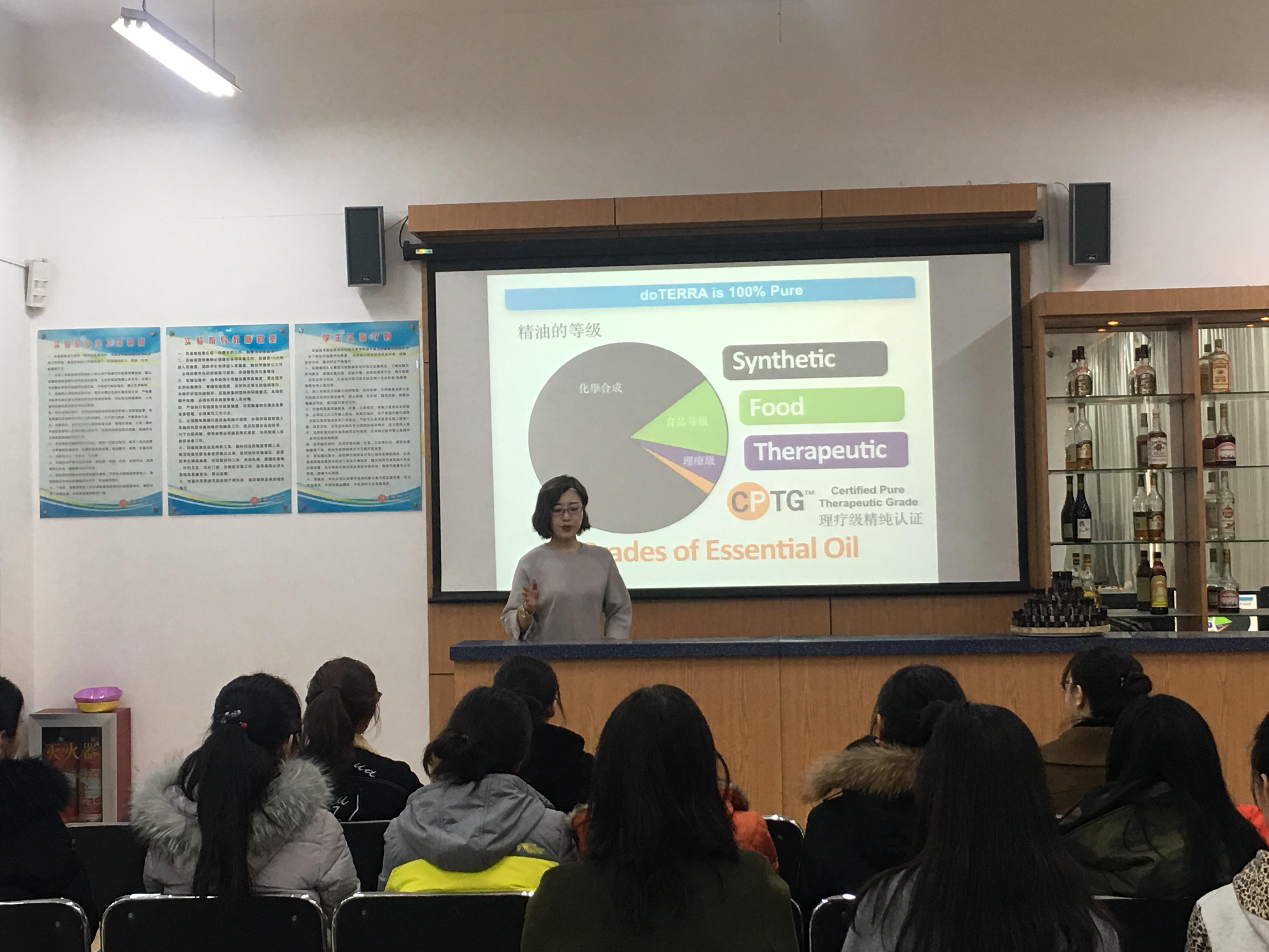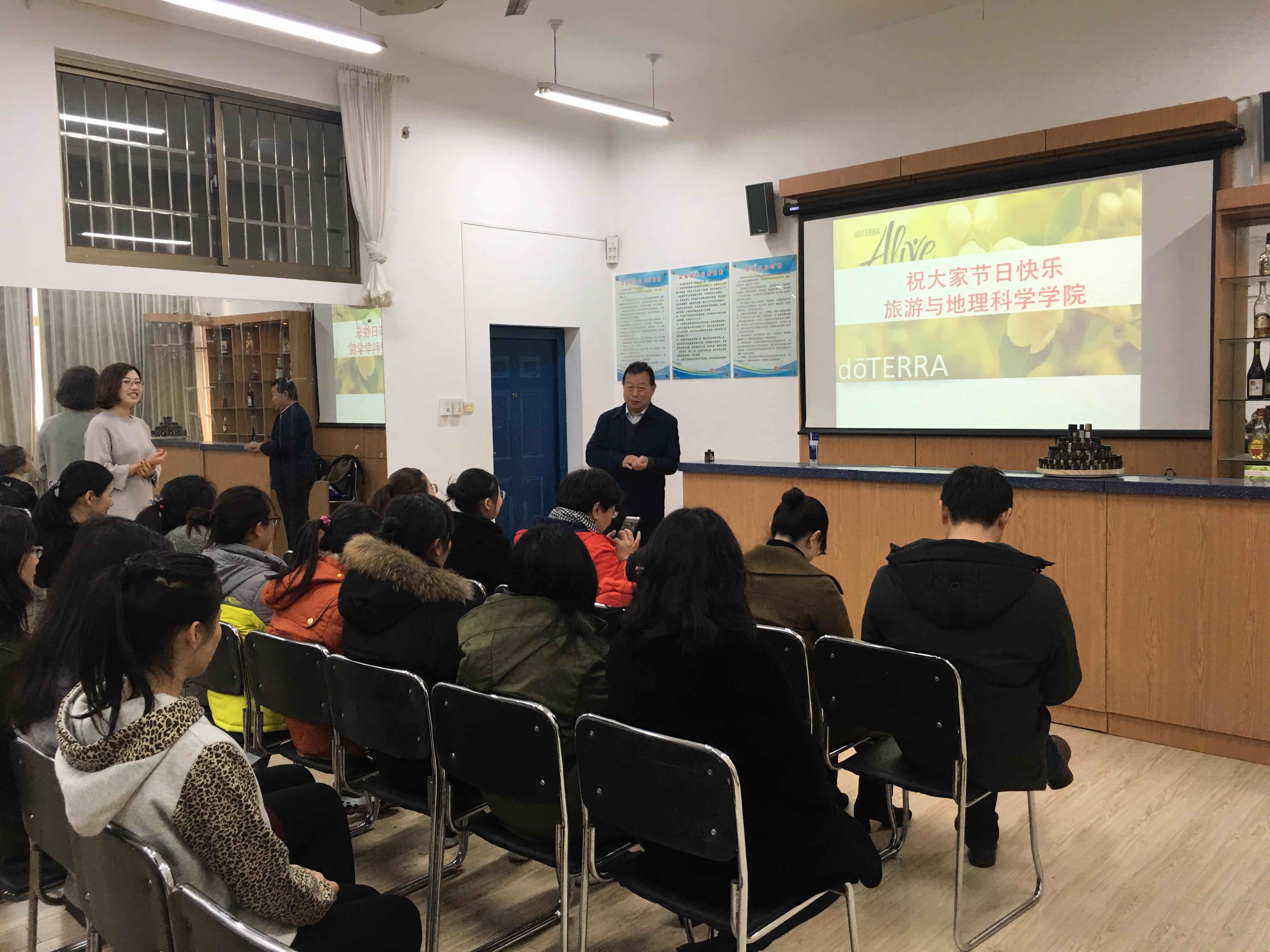 阳春三月,万物更新。3月9日下午,为庆祝“三八”国际妇女节,丰富女职工业余文化生活,旅游与地理科学学院在院酒店管理实验室组织开展了题为《植物芳香课堂》精油知识讲座。讲座开始刘善东书记和耿庆汇院长代表学院为全体女老师送上了节日的祝福,接下来由中国高级精油疗法康复理疗师文莉老师从植物疗愈功效、精油品质辨别、精油功效等方面进行了详细讲解,并与大家现场互动,女老师们在精油温馨芬芳的氛围里收获了精油与人体健康的相关知识。随后,在文老师的指导带领下,老师们学习了手工精油皂的制作流程和技巧,并根据自身体质,动手制作了一块属于自己的专属精油皂,大家在欢声笑语中体验了亲自创作的成就感。