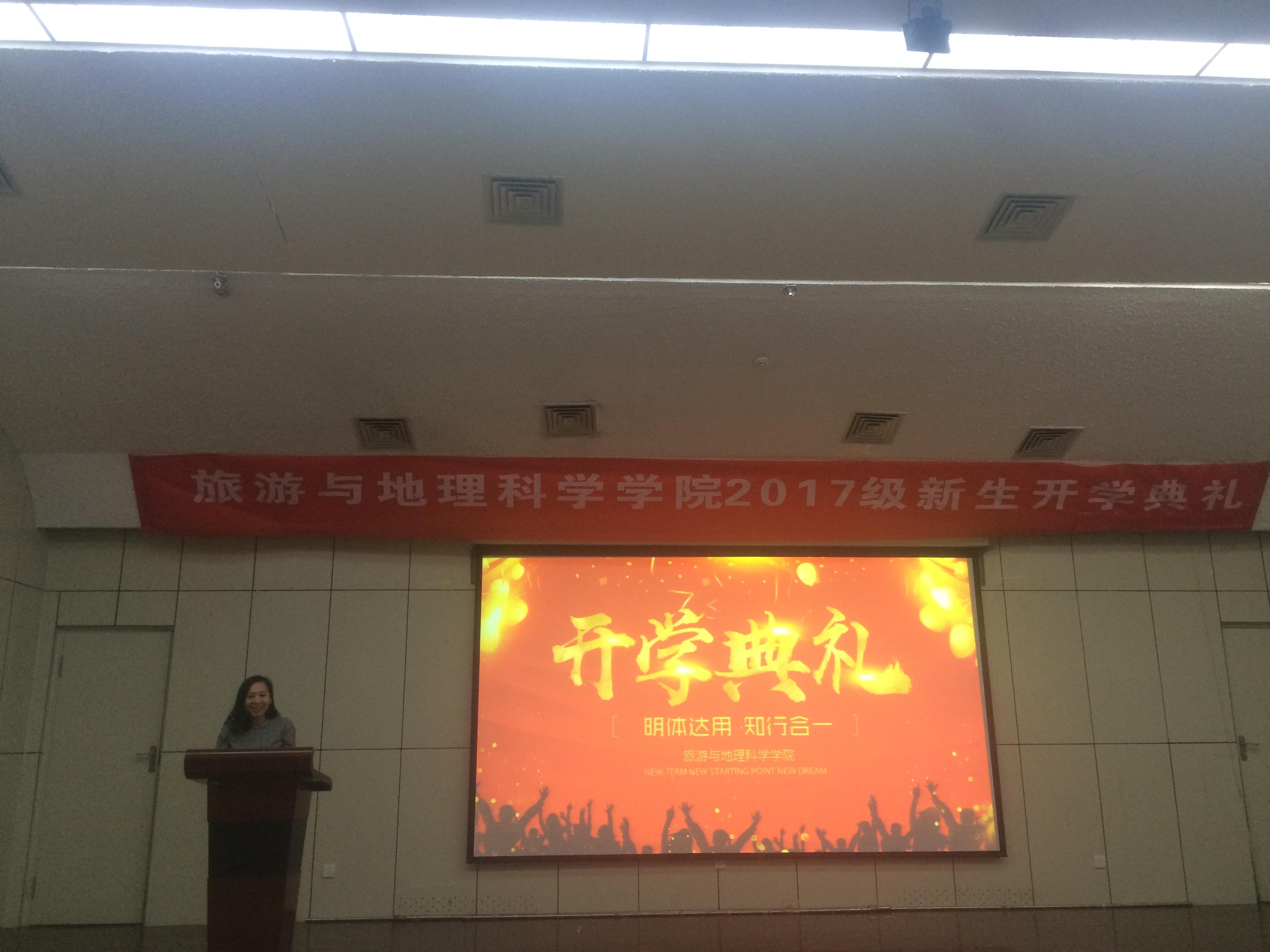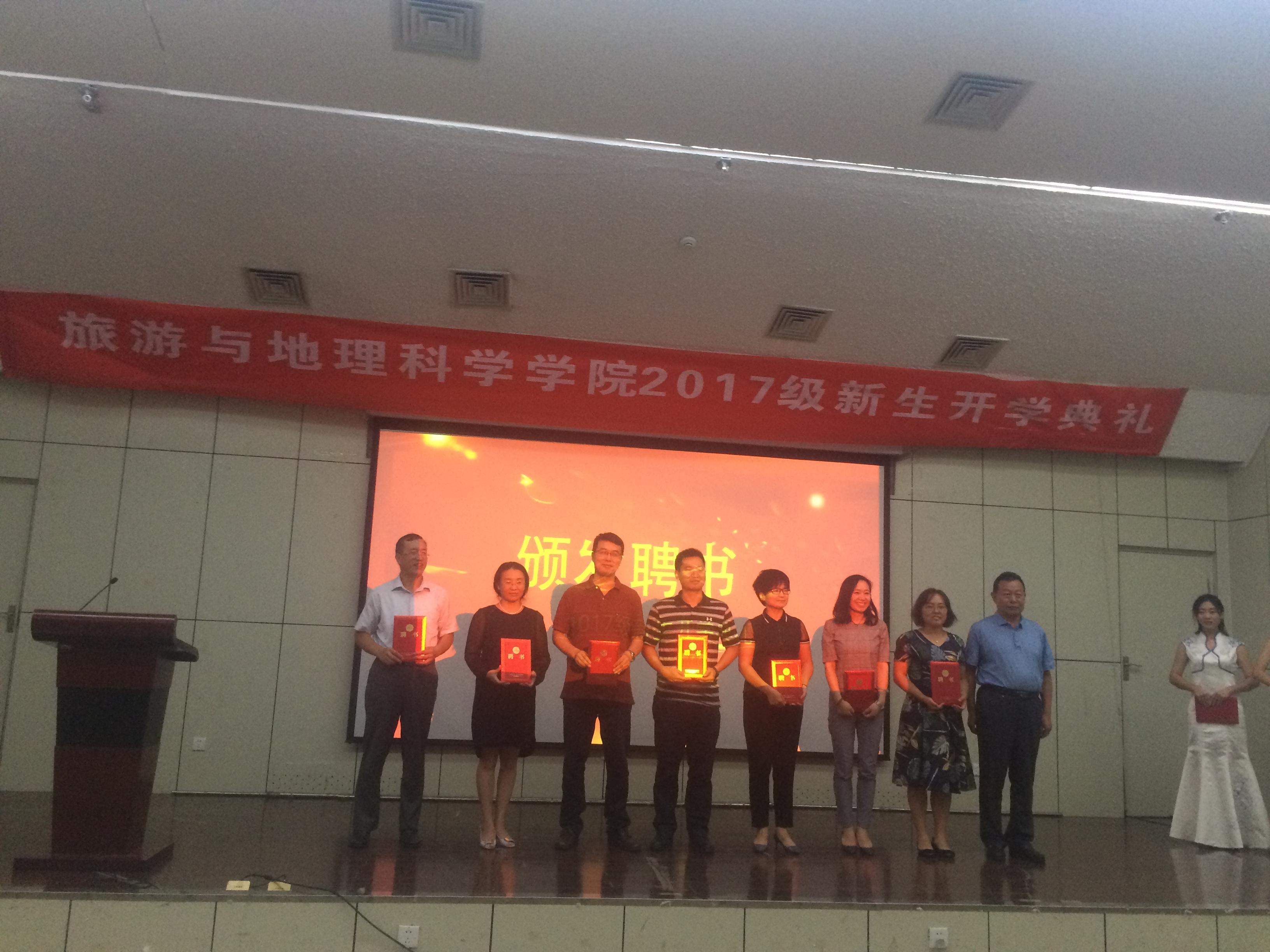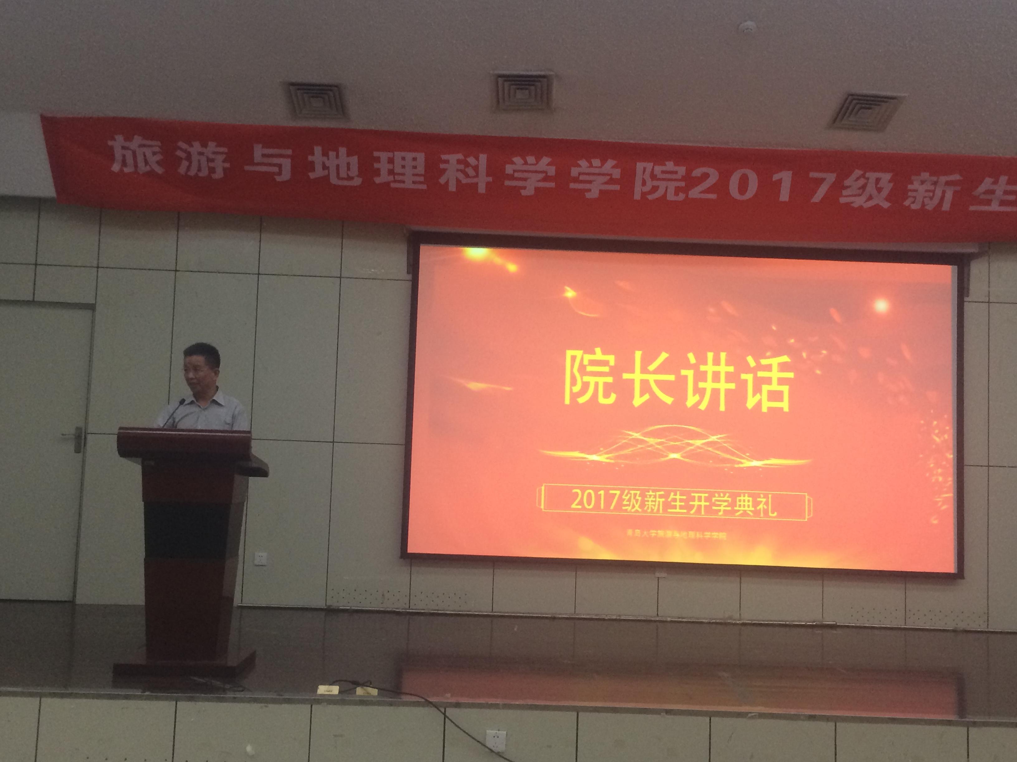 中心校区图书馆报告厅举行了2017级新生开学典礼暨师生见面会。旅游与地理科学学院党委书记刘善东、院长马波、副院长耿庆汇、张言庆、党委副书记孙志军、学院全体教职工及2017级全体同学参加了此次开学典礼。