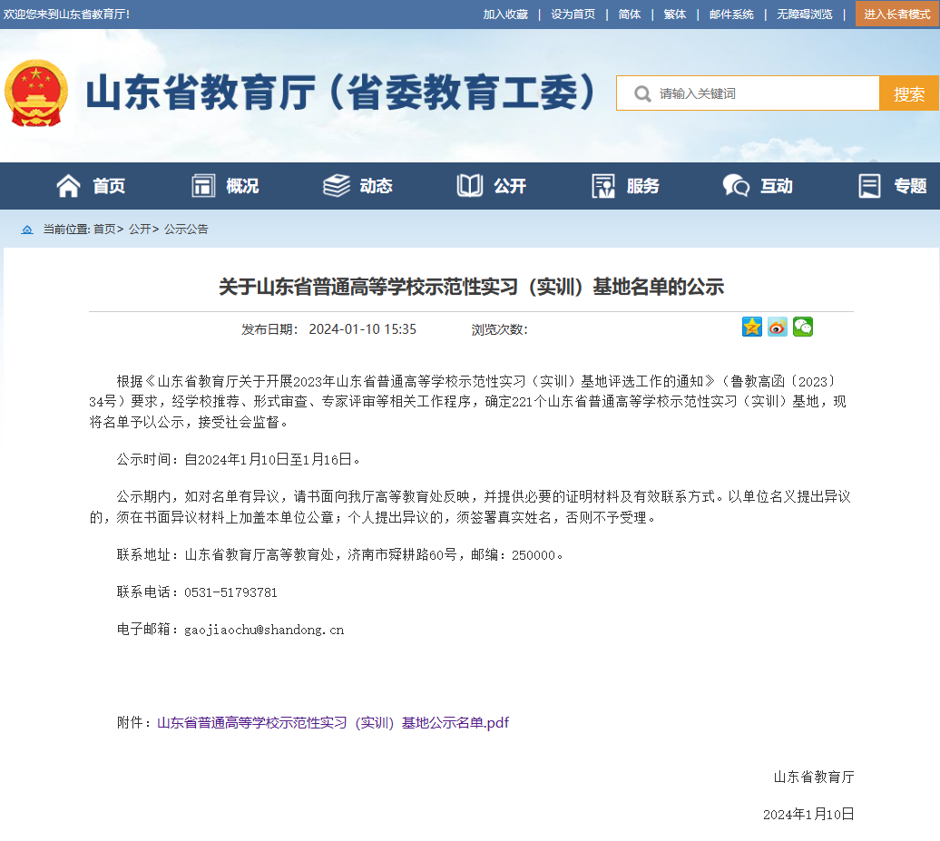 近日,山东省教育厅公布了2023年山东省普通高等学校示范性实习(实训)基地名单,我院建设申报的“黑料不打烊