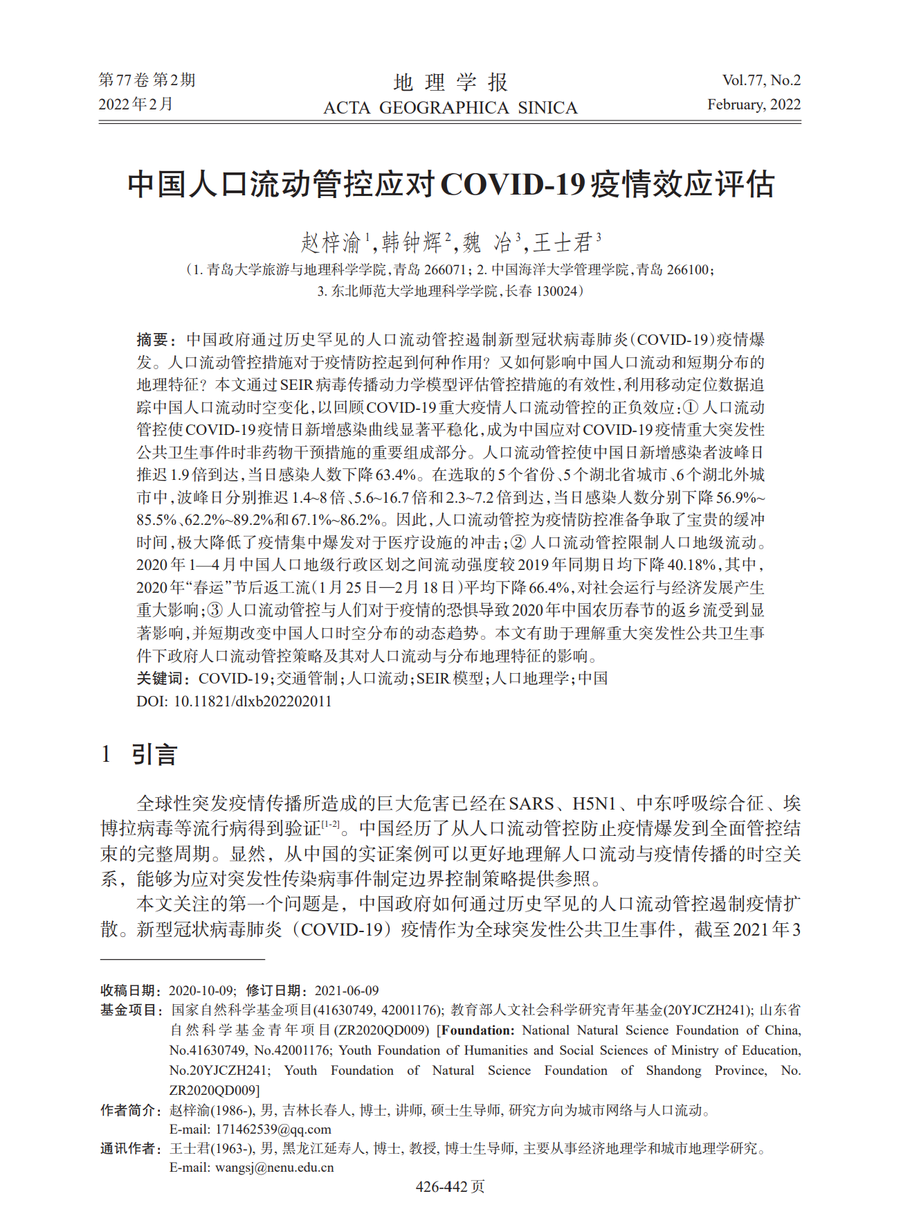 旅游与地理科学学院教师赵梓渝在《地理学报》发表论文《中国人口流动管控应对COVID-19疫情效应评估》
