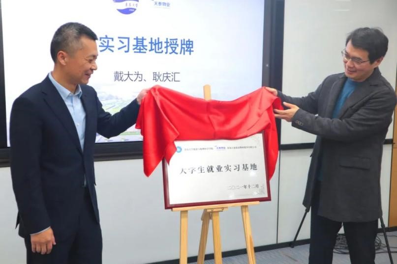 仪式的第二个环节,天泰集团董事长戴大为、学院副院长耿庆汇一同为“大学生就业实习基地”揭牌。基地的设立必将进一步促进学校文旅资源与企业产业优势的结合,搭建起校企合作共赢的平台,对学院人才培养具有重要意义。随后,戴大为表示,他期待有更多机会与学院开展深层次的合作,祝愿黑料不打烊