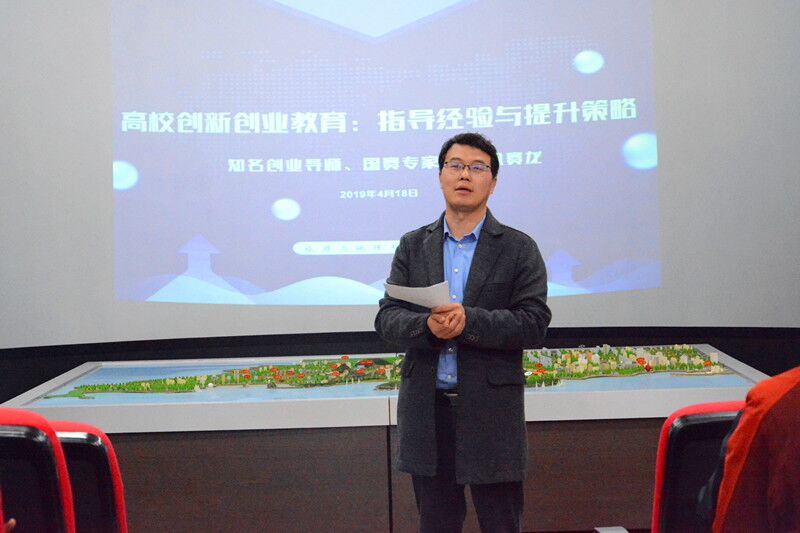 浮山校区数字旅游实验室举办创新创业教育专题讲座,青岛华通创业投资有限公司及青岛华创科技园管理公司副经理、高级工程师、知名创业导师、国赛评委徐赛龙受邀出席本次活动,旅游与地理科学学院第二届创新创业大赛参赛团队的指导老师及成员代表参与本次讲座,本次讲座由学院副院长耿庆汇主持。