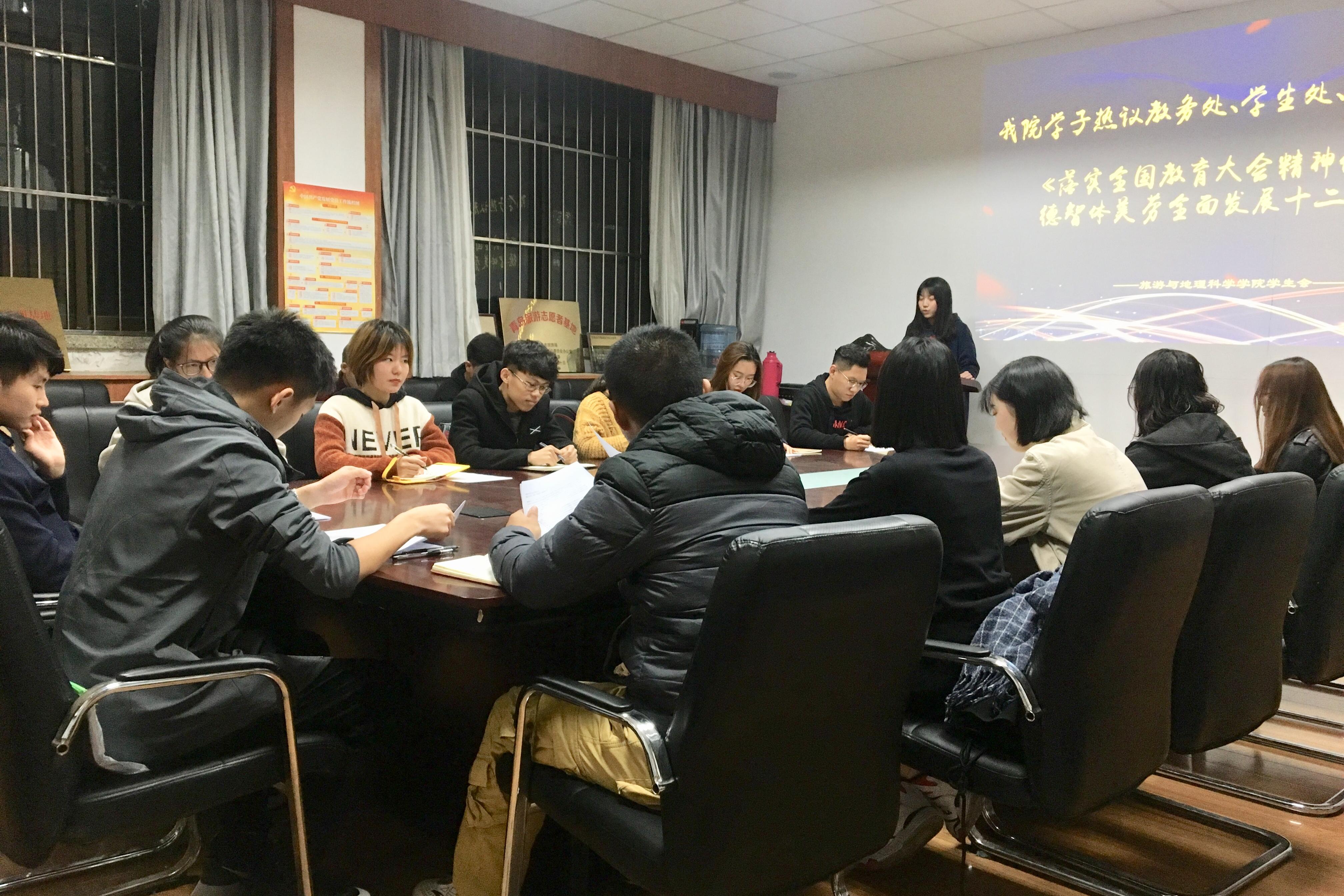 旅游与地理科学学院在睿思楼122室就《落实全国教育大会精神促进学生德智体美劳全面发展十二条措施》进行了深入讨论,学院各年级学生代表及学生会代表参与会议。