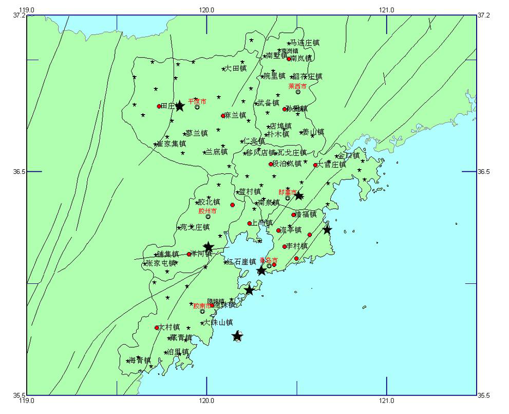 青岛市测震台网与强震台网(★ 测震台网地震台,●强震台网地震台)