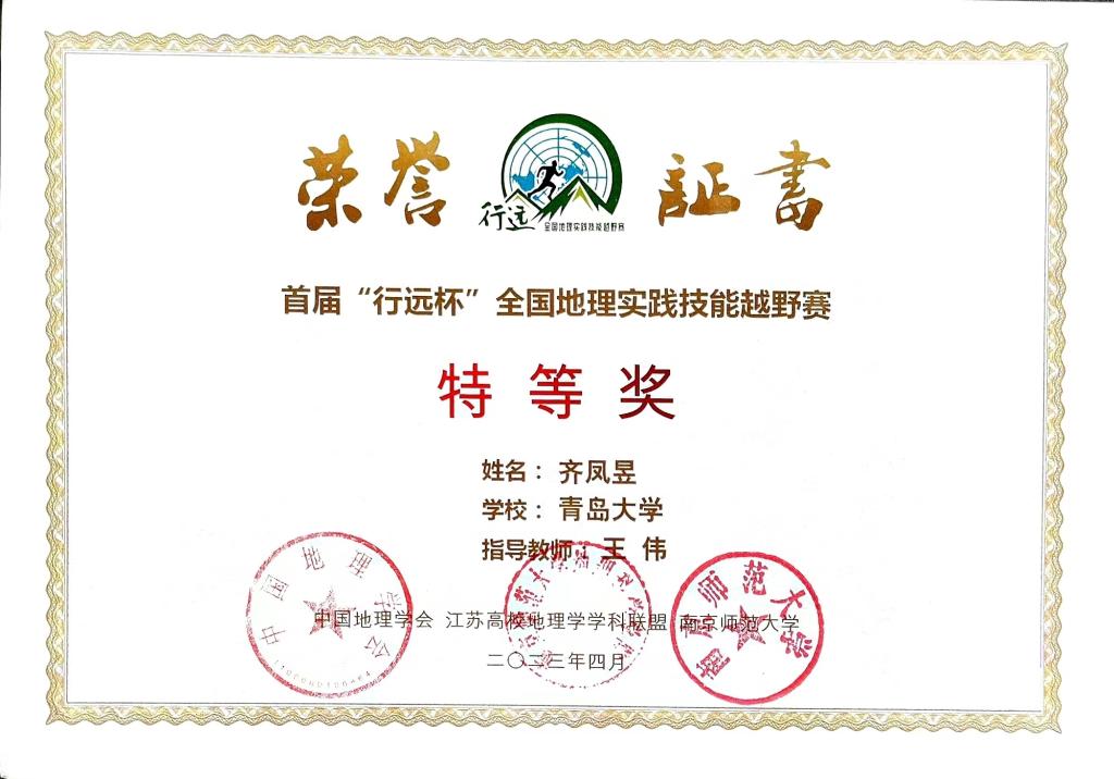由中国地理学会、南京师范大学、江苏高校地理学学科联盟共同主办的首届“行远杯”全国地理实践技能越野赛决赛于2023年3月18日在南京举行。我院齐凤昱同学以学生组第一名的优异成绩荣获特等奖,王伟老师荣获优秀指导教师奖。