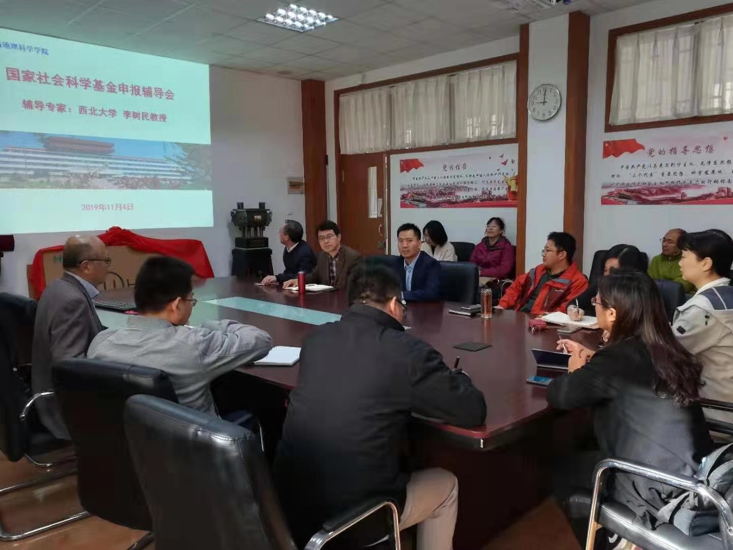2019年11月4日上午9点,旅游与地理科学学院在睿思楼122会议室举办国家社科基金申报辅导会。本次辅导会邀请了国家社科基金会评专家、西北大学李树民教授,会议由张言庆副院长主持。