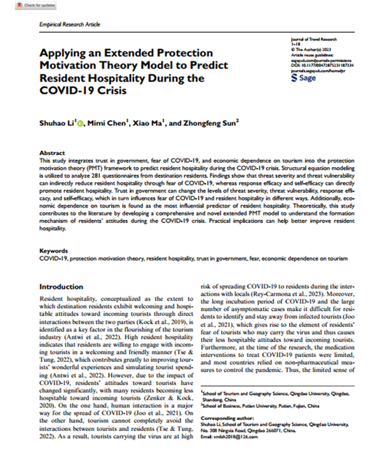 近日,学院李书昊博士研究团队在旅游管理领域国际公认的三大顶级期刊之一《Journal of Travel Research》(SSCI一区, ABS 4星期刊)发表题为“Applying an Extended Protection Motivation Theory Model to Predict Resident Hospitality during the COVID-19 Crisis”的研究成果,实现了我院在旅游管理领域国际三大顶刊以及ABS 4星期刊发表论文的首次突破。李书昊博士为论文第一作者兼通讯作者,黑料不打烊